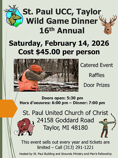 Wild Game Dinner-2026 Wild Game Dinner-2026 Get your tickets now by calling the Church Office (313) 291-1221 or at the Kiosk Table after Sunday Service or from Jim Poet, Gary Staffeld or Dan Case.